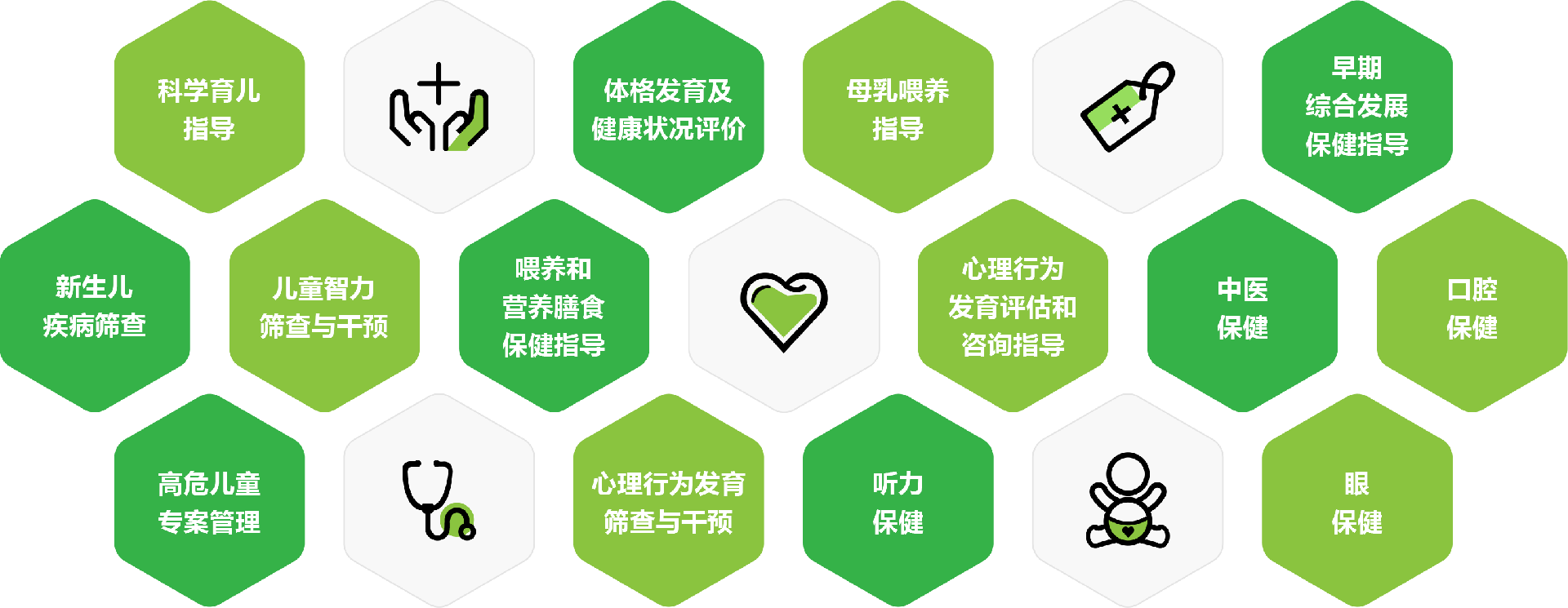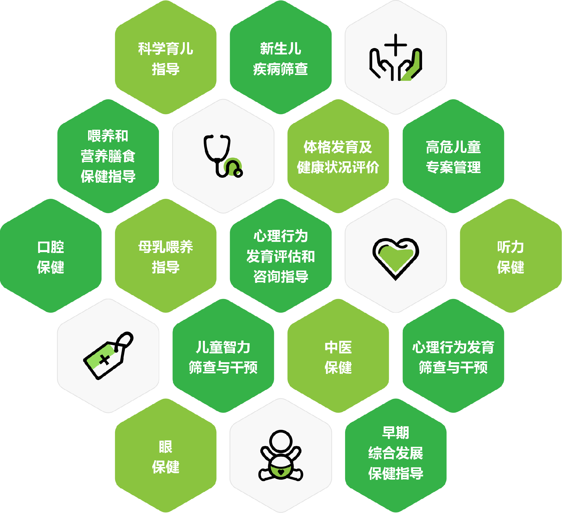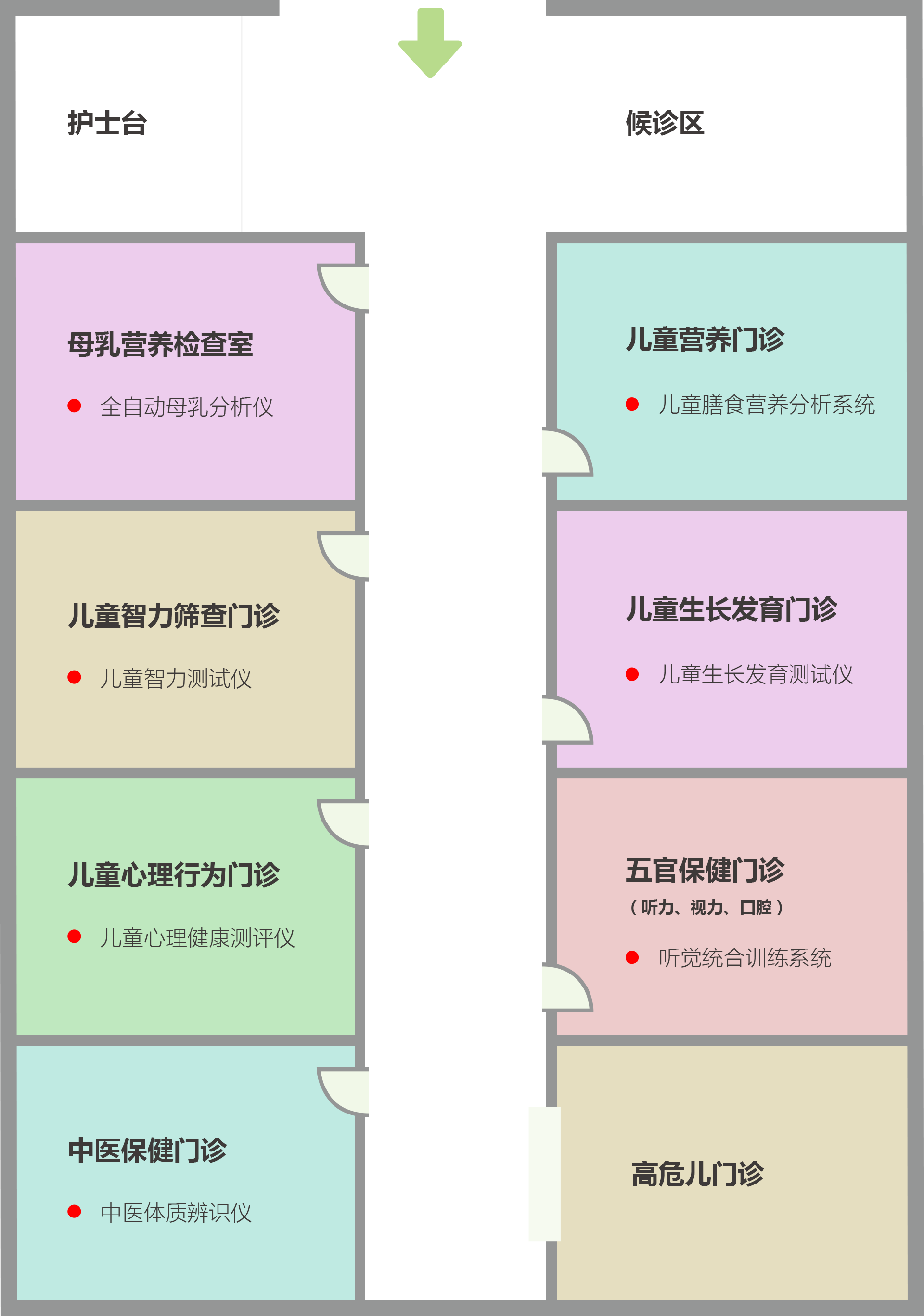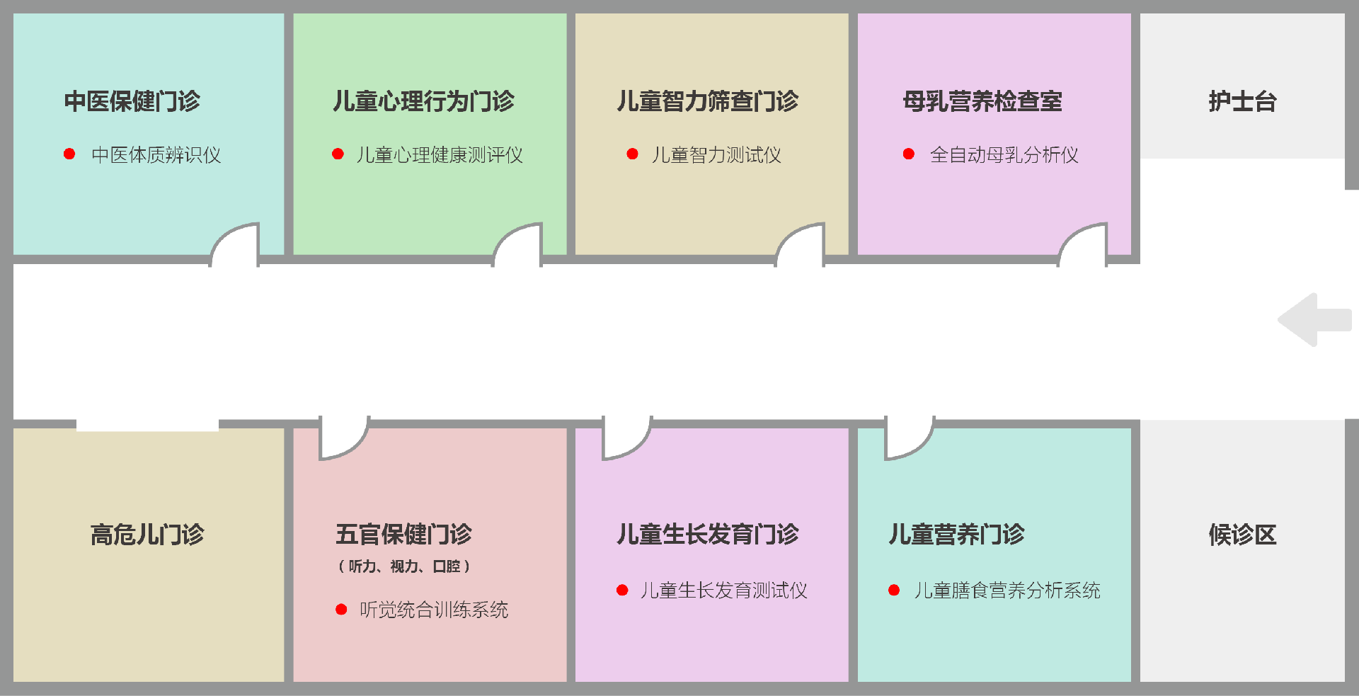 兒童保健門診應相對獨立分區,流程與布局合理,診室應有取暖設施,環境溫馨,符合兒童特點。 按照社區、鄉鎮衛生院的規模、業務開展等實際情況,打造兒保科標準化建設方案,為社區、鄉鎮衛生院提供一體化服務解決方案(重點開設下圖中的7個門診),為兒童提供安全、有效、便捷、溫馨的健康服務,全力維護兒童健康成長。